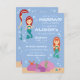 Mignonne caricature sirène filles nageant dans l'océan au-dessus du crabe sur des rochers et des bulles. Invitation de la piscine d'été pour les enfants nageurs. Thème de la vie océanique, belles soeurs de princesse sous-marine.