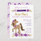 Invitation à une fête pour un anniversaire ou une douche sur le thème du cheval ou du poney en violet et or. Contactez le vendeur pour des options de couleurs personnalisées.