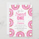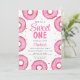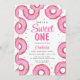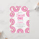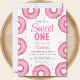 Prévoyez-vous une fête d'anniversaire pour une fille ? Cette mignonne invitation de fête d'anniversaire de la fille Donut est décorée de beignets d'aquarelle rose et d'une typographie élégante. Il y a un motif de beignes à l'arrière. Facile à personnaliser. Aquarelle originale © Michele Davies.