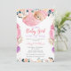 Pink Bear Girl on Her Way, Floral & Balloons Baby shower Invitation. Dispose de mignon ours en peluche rose avec des ballons dorés et roses sur arrière - plan parties scintillant rose fleurie et or. Parfait pour mignon, "c'est une fille", amusant, rose, lunatique, magique, floral et teddy thème baby shower.