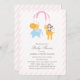 Cette invitation de baby shower comporte un mobile animal de safari sur un arrière - plan rayé très rose-clair. Conception de ©Blackleaf de graphiques.