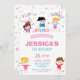Célébrez votre prochaine fête d'anniversaire de petite fille avec cette invitation impressionnante de fête d'anniversaire de gymnastique. Comporter de petits gymnastes mignons renversant, rebondissant, dégringolant et sautant. Personnalisez cette grande invitation avec vos détails de partie facilement et pressez rapidement, simplement la personnaliser il bouton plus loin pour réarranger et composer le style et le placement du texte. (c) Le studio heureux de chat.