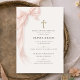 Pink coquette style first holy communion invitation featuring delicate bows and a soft, feminine design for a girls special day. Designed to share celebration details with an elegant and reverent look that feels sweet and timeless. Ideal for first communion ceremonies, family gatherings, and religious celebrations. Editable text. Clean print-ready layout.
