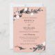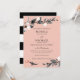 Design élégant à la feuille et aux fleurs avec des branches délicates du feuillage en noir, gris et corail sur un arrière - plan rose pâle. Les cartes sont retournées à une bande noire et blanche. Un design moderne et classe pour des mariages chics et élégants pour toute saison.