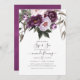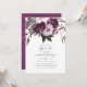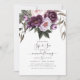 Invitation de Sip and See à l'aquarelle peinte à la main de fleurs boho violettes et prune avec une typographie élégante écrite à la main.