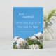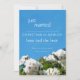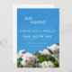 Belle faire-part de fête fleurie "juste mariée" avec des roses blanches rêvées et un ciel d'été bleu clair.