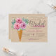 Invitation à la douche nuptiale avec cône de crème glacée rempli de bouquet de fleurs roses rousses et de feuilles verdoyants, et points de parties scintillant rose.