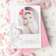Ces mignons invitations de baptême gris rose et blanc donnent aux invités une sensation estivale chaleureuse. Le look des fleurs sauvages dessinés à la main est très élégant, mais capricieux et naturel. Un agencement simple et propre est conçu pour focaliser toute l'attention sur la photo de la petite fille.