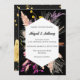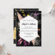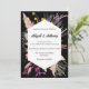 Mélangeant avec élégance des éléments contrastés, cette invitation de mariage époustouflante présente un design floral multicolore vibrant qui s'épanouit sur un fond noir profond. Enveloppée dans une bordure géométrique intemporelle, la police stylée de la carte ajoute une touche de sophistication moderne, promettant une célébration mémorable d'amour et de joie.