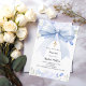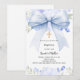 Un fond blanc, décoré avec un grand ruban bleu clair, une croix dorée et des fleurs bleues, fleurs. Personnalisez et ajoutez le nom et les détails détails.