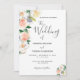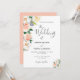 Un faire-part de mariage fleuri tendance en blanc, corail et pêche. Un arrière - plan blanc chic à l'avant. Décoré de grandes fleurs verdoyantes aux couleurs de l'eau, de fleurs blanches, de corail et de pêche. Un grand script à main moderne, typographie avec le texte : Le mariage de. Modèle pour les noms et les détails mariages. Texte gris foncé. Retour : arrière - plan de couleur corail.