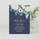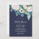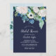 Cette classique invitation à la douche nuptiale à fleurs blanches est parfaite pour une douche mariage de automne. L'élégant design floral présente des roses blanches et en ivoire, des pivoines et du chrysanthème, avec des touches de fleurs d'aquarelle bleu percé et du feuillage vert sur un arrière - plan bleu foncé.