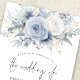 Faire-part de mariage à code QR Florales Bleu Poussiéreux Moderne. Disponible numériquement et imprimé. De belles fleurs aux couleurs estivales en bleu clair et blanc ornent le bord supérieur. Ajoutez votre code QR à votre site web de mariage au verso pour que vos invités puissent répondre et voir tous les détails en ligne sans avoir besoin d'insertions séparées. Une typographie informelle en noir pour le titre principal "Le Mariage De" qui complète le reste du texte que vous pouvez facilement personnaliser.