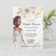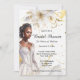 Une belle aquarelle afro-américaine / mélanine femme est encadrée par un arrière - plan blanc qui a de jolies fleurs florales blanches sur le bord supérieur. Elle porte une robe mariage de style bustier blanc et bas, qui a des détails de dentelle et porte un diamant et de longues boucles d'oreilles pendantes pour compléter sa robe. Ses cheveux sont balayés dans un chignon chic et désordonné qui encadre doucement son beau visage. Les modèles noirs semblent à sa droite pour votre libellé personnalisé et l'arrière - plan a des flèches d'or pâle et de marbre gris sur elle. Ce design est idéal pour des douches nuptiales élégantes, simples à fleurs ou botaniques blanches et faux or.