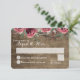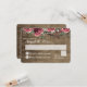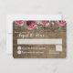 Une tranche de monogramme en bois est décorée avec une florale aquarelle bohème chic de brindilles, baby's breath, roses et autres feuillages botaniques. Des roses de Bourgogne sylvestres et une carte de réponse de mariage rustique de campagne en bois de grange avec du bois de grange sombre et des roses rouges de Bourgogne colorées accompagnent notre invitation de mariage en dalle d'arbre.
