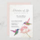Invitation de célébration de la vie présentant deux beaux colibris à l'aquarelle ornant une illustration de fleur rose avec une corde dorée. Conçu dans une palette de couleurs vives avec du rose, du bleu, du violet, de l'orange, du jaune et du vert.