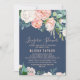 Cette carte d'invitation à la douche en lingerie bleue aux fleurs de pivoine romantique est parfaite pour une douche nuptiale élégante. Le design floral présente des fleurs d'aquarelle rose pâle, pêche et blanche en cascade sur un arrière - plan bleu marine.