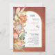 Invitation de mariage tropicale avec fleurs de protea, herbe des pampas et feuilles d'eucalyptus sous une arche en terre cuite. Ce beau design de mariage présente un cadre en arche sur fond taché de terre cuite avec vos initiales et votre texte. Sur la gauche, il y a des fleurs de protea, de l'herbe des pampas et des feuilles d'eucalyptus.