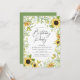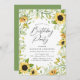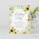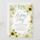 Des invitations à des fêtes d'anniversaire élégantes et fleuries, avec des détails de votre fête, entourées de tournesols aquarelles et d'un feuillage vert luxuriant. Les invitations de la fête d'anniversaire de tournesol se retournent vers un arrière - plan vert solide.