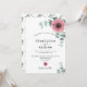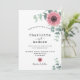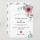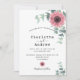 Un arrière - plan blanc chic. Décoré de tournesols roses, de fleurs et de verdure d'eucalyptus. Personnalisez et ajoutez vos noms et les détails du mariage. Lettres noires. Retour : un motif de feuilles d'eucalyptus et d'oliviers.
