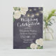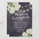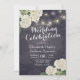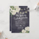 Mariage Célébration Invitation Cartes Modèle - Elégante Fleurs d'Hydrangée Blanche et Lumières à cordes sur Vintage Navy Blue Floral Linen Arrière - plan. Un design parfait pour votre grand jour. Tous les styles de texte, couleurs, tailles peuvent être modifiés selon vos besoins !