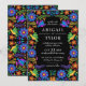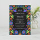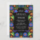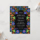 Invitation de mariage Colorée Fiesta mexicaine avec des fleurs d'art populaire sur un fond noir dramatique (vous pouvez changer la couleur pour l'adapter à vos goûts). Idéal pour les mariages au Mexique, les mariages de Cinco de Mayo ou pour quelqu'un qui aime la culture mexicaine. Fait partie de notre collection Mexican Flowers.