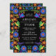 Invitation de mariage colorée pour une fiesta mexicaine avec des fleurs d'art populaire sur un fond noir dramatique (vous pouvez changer la couleur pour l'adapter à vos goûts). Idéal pour les mariages de destination au Mexique, les mariages de Cinco de Mayo ou pour ceux qui aiment la culture mexicaine. Fait partie de notre collection Fleurs Mexicaines.