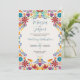 Cette Faire-part de mariage botanique mexicaine de Nuestra Boda présente un agencement floral riche et vibrant autour des bords, avec des couleurs audacieuses comme le rouge, l'orange, le bleu, le violet et le jaune qui créent une atmosphère festive et accueillante. Les fleurs sont associées de manière complexe à des motifs feuillus et à de petits ornements détaillés, donnant au design un aspect vivant et texturé. L'équilibre des couleurs vives et contrastées et l'agencement délicat et symétrique en font une option attrayante pour une papeterie mariage festive, surtout celle à thème traditionnel ou folklorique.