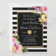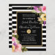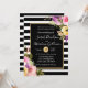 Cette faire-part de mariage étonnante et frappante présente des rayures noires et blanches audacieuses avec une garniture dorée et des fleurs jaune violet rose. Les roses violettes roses et jaunes aux couleurs printanières apparaissent vraiment et chantent magnifiquement sur ce magnifique faire-part de mariage.