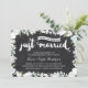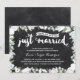 Cette élégante et moderne invitation d'anniversaire de mariage de 25 ans présente une belle calligraphie au pinceau, de belles fleurs bleues et blanches, une typographie qui indique "Juste mariés (il y a vingt-cinq ans!)", et un fond ardoise rustique.