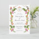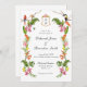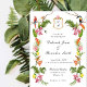 Magnifique invitation de mariage tropical à l'aquarelle peinte à la main, encadrée par un arrangement délicat de fleurs tropicales colorées, de feuillage et d'oiseaux. Ce design présente également un simple monogramme d'initiales empilées dans une crête, ce qui donne une impression très personnalisée et peinte à la main.