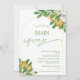 Moderne Pink Flora Lemon Main Squeeze Douche nuptiale Invitation Arc moderne elle a trouvé sa principale invitation à la douche nuptiale pressée avec une arche à ligne jaune et deux arrangements citrons et floraux avec des fleurs roses. Cette invitation à la douche nuptiale à thème citron comprend également un mot de calligraphie moderne et un motif en tuiles vertes à l'arrière.