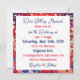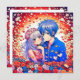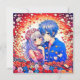 Invitations de mariage personnalisées avec un thème anime. Un garçon et une fille qui bouillonnent entouré de coeurs et de fleurs colorés. Mignonne fille anime et garçon avec les cheveux bleus. Les couleurs sont principalement rouge, bleu, blanc et rouge.