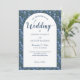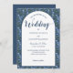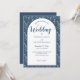 Cette invitation de mariage personnalisée présente des illustrations de fleurs de delphinium bleu clair dressées contre un arrière - plan bleu marine. La forme blanche de l'arc ou de l'arcade au centre est prête à être personnalisée avec tous vos détails dans la coordination du lettrage bleu marine.