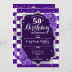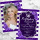 Elégante invitation à 50e anniversaire fleurie avec votre photo au verso de la carte. Design blanc violet glam avec faux parties scintillant argent. Comprend des rayures, des roses violets, des caractères de script et des confettis. Parfait pour une fête anniversaire adulte élégante. Personnalisez avec vos propres détails. Peut être customisé pour n'importe quel âge ! Invitations Zazzle imprimées ou téléchargement instantané modèle imprimable numérique.