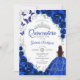 Royal blue silver and white floral Quinceanera celebration invitation. Features brunette girl in ball gown dress, script font, silver butterflies, watercolor roses and tiara. Perfect for an elegant princess style glam celebration. Personalize with your own details. Printed Zazzle invitations or instant download digital printable template.