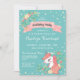 Adorable invitation de fête d'anniversaire avec une licorne avec des cheveux ombragés en rose rose et pêche, entourée de jolies fleurs en rose, bleu et jaune pâle. Anniversaire est écrit en gris sur un arc rose. L'arrière - plan est turquoise et parsemée d'une douche aux minuscules fleurs jaunes. L'arrière présente des rayures aux couleurs roses.