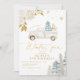 Jolie et élégante invitation d'anniversaire d'hiver avec des fleurs aux accents dorés et un adorable petit bonhomme de neige.