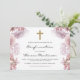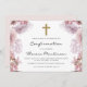 Ce magnifique design de Confirmation présente une belle bordure fleurie rose et violet sur un arrière - plan blanc avec une croix de couleur or au centre du design. Personnalisez le nom dans un joli script, et incluez des détails d'occasion importants. Le fond de l'invitation est un joli rose pastel.