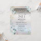 A modern, chic and glamorous invitation with an elegant gold tiara, string lights, butterflies, and pink flowers on a silver background.