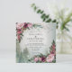 Faire-part de mariage à l'aquarelle Rose Poussiéreuse de la Forêt de Pins présente un arrière-plan boisé de feuillage persistant accentué de cadres d'angle de fleurs bordeaux et rose poussiéreuse, de pommes de pin, de pin et de fougère. La scène est complétée par une volée d'oiseaux qui traverse le ciel. Un mélange de typographie moderne complète l'invitation. Modifiez le texte, utilisez simplement l'option de personnalisation et faites-en votre propre. Le dos de la carte présente également un fond forestier romantique à l'aquarelle pour le monogramme de la mariée et du marié. Conçu par l'artiste de mariage Nancy Lambert. Envoyez-moi un message pour des variations personnalisées. Cette belle invitation rustique ainsi que d'autres éléments essentiels de mariage font partie de notre COLLECTION DE MARIAGE À L'AQUARELLE FORET DE