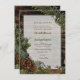 Un faire-part de mariage à thème de forêt rustique pour l'homme de montagne et le fabuleux sprite boisé. Ce design est un arrière - plan rustique de planches de bois foncé et agrémenté de branches à feuillage persistant en cèdre, sapin et pinecones élégantes. Personnalisez en ajoutant le nom de la mariée et du marié, ainsi que les détails du mariage.