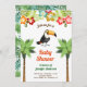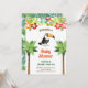 Éblouissez vos invités avec cette invitation de baby shower à thème tropical avec un toucan mignon et de beaux éléments hawaïens avec typographie vibrante sur un arrière - plan blanc. Ajoutez simplement les détails de votre événement sur ce modèle facile à utiliser pour en faire une invitation unique. Retournez la carte pour révéler un motif feuille tropical au verso de la carte.