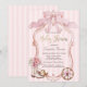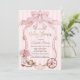 Watercolor pink bow, retro frame, cowgirl hat, boots and wheel on pink striped background. Ideal for a chic, feminine baby shower brunch celebration, this design blends a sweet coquette style with soft, inviting colors.