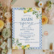 Frame Jaune Floral Lemon Thème nuptiale Invitation Elle a trouvé sa principale invitation à la douche nuptiale pressée avec quelques fleurs jaunes et blanches, des citrons et des arrangements de feuillage et une bordure en tuiles bleues méditerranéennes. Idéal pour une douche nuptiale de printemps ou d'été.