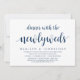 Scénario moderne dans un thème élégant bleu marine, carte d'invitation de fuite en mariage (Dîner avec les jeunes mariés). C'est parfait pour votre dîner de mariage décontracté au bord du lac, danser et faire la fête.
