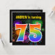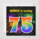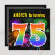 Ce design amusant et dynamique d'invitation à la fête d'anniversaire comprend un motif coloré inspiré par des feux d'artifice festifs éclatants, ainsi que le numéro "75" avec un spectre multicolore d'inspiration arc-en-ciel ou motif dégradé. Le nom sur le devant peut être customisé. Le dos présente des détails personnalisés sur la fête. Des invitations à des fêtes d’anniversaire comme celle-ci pourraient être envoyées aux participants potentiels pour une fête d’anniversaire organisée pour célébrer le soixante-quinzième anniversaire de quelqu’un. [~Z0000337]