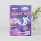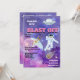 Si vous organisez une fête d'anniversaire sur le thème de l'espace pour votre fille, cette illustration d'un adorable alien vert de dessin animé volant dans un vaisseau spatial OVNI à travers une galaxie remplie d'étoiles et de planètes bleues, roses et violettes avec des météores est le design idéal pour votre événement. Les modèles peuvent être personnalisés pour répondre à vos besoins et l'âge de la fille d'anniversaire ajouté au verso de l'invitation. Ce design est également idéal pour les fêtes pour enfants sur le thème des aliens et de la galaxie.