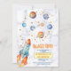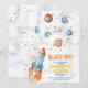 Planètes à l'aquarelle avec une fusée décollant devant des nuages doux. Décollage ! pour célébrer votre occasion spéciale avec ce design adorable.