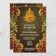 Un beau arrière - plan de cachemire brocart dans un vert de forêt profonde est encadré par un cadre décoratif doré orné qui a de petits tourbillons de cachemire sur lui. Un Ganesha d'or audacieux, le Dieu de la sagesse, les débuts et l'élimination des obstacles. Cette conception inspirée de l'hindi a des modèles blancs sur elle pour votre libellé personnalisé et le dos a un modèle supplémentaire pour plus de détails aux invités et à la famille qui peut être supprimé si non requis. Les tons chauds et riches confèrent à ce design une atmosphère luxueuse, élégante et haut de gamme. Cette invitation est idéale pour célébrer n'importe quelle cérémonie hindoue ou toute célébration ou mariage ethnique asiatique.